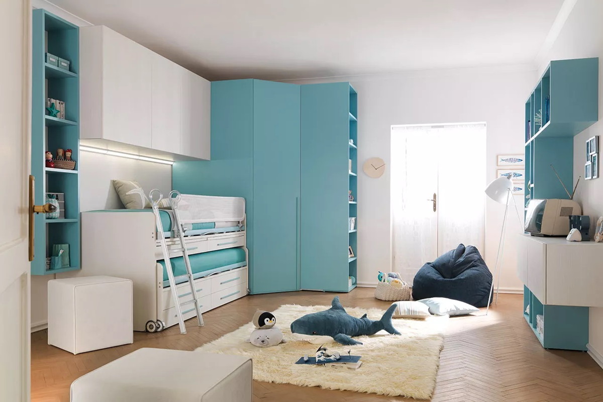 Il sistema letto Space e` dotato di due letti, sei cassetti e due scrivanie. Per il letto piu` alto c’e` la protezione Web Split a ribalta in tubolare di metallo (25 mm di diametro) con chiavetta di sicurezza: in questo modo la protezione puo` essere sbloccata solo attivando il meccanismo di fissaggio, per esempio nel momento in cui e` necessario rifare il letto.